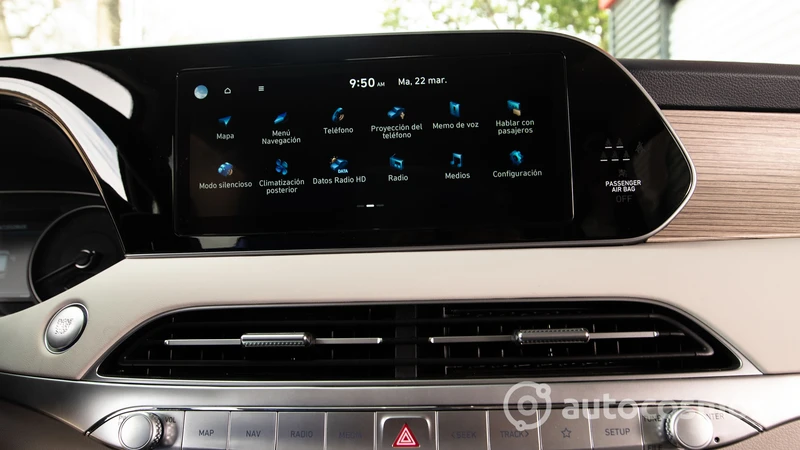 La pantalla central táctil es de 10.25” con la tradicional interfaz de Hyundai que es fácil de utilizar y cuenta con compatibilidad con Apple Carplay y Android Auto. Pero sucedió que el Android Auto se desconectaba frecuentemente, probé con varios cables distintos y no se solucionó, probablemente fue un tema particular de la unidad de pruebas, pero no deja de ser incómodo.