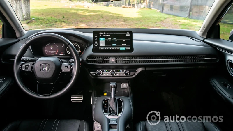 Puertas adentro tiene una estética extraída del Civic, lo que me parece buena cosa. Destaca por una tira tipo panal de abeja que recorre el tablero escondiendo las salidas de aire, con los mandos del climatizador puestos por debajo, y deja en voladizo una pantalla multifunción de 7 o 9 pulgadas para el sistema de infoentretenimiento, que cuenta con conectividad inalámbrica a Apple CarPlay y Android Auto, además de los siempre necesarios botones físicos de acceso directo y una perilla de volumen para el audio.